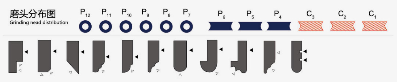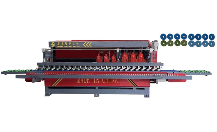 該機(jī)采用數(shù)控,配置觸摸屏、變頻調(diào)速,帶記憶功能,帶電動(dòng)壓桿,為手、自動(dòng)一體機(jī),磨料帶自動(dòng)補(bǔ)償,磨頭更換秒吸。加工后的圓邊不帶絲,接近板面亮度,可磨削加工不同尺寸、厚度石材的大小圓邊、法國(guó)邊、21號(hào)邊、鴨嘴邊、407等各種異形線形,一次性完成粗磨、精磨和拋光。該機(jī)結(jié)構(gòu)先進(jìn)合理,精準(zhǔn)度高,效率快,操作方便,維護(hù)簡(jiǎn)單,最大加工速度4m/分鐘,機(jī)械正常使用相當(dāng)于正常石材加工15個(gè)工人的工作量,并且杜絕出現(xiàn)人工加工時(shí)產(chǎn)生的工藝缺陷。